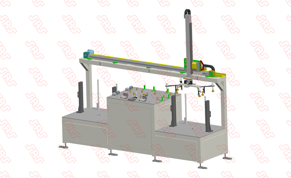 將2個拆垛工位加上1個拆垛機械手集成在1個機架上,節(jié)省空間,適合中小號薄板料場合,板料經(jīng)過片料機的拆垛和對中并輸送到機器人取料位置。